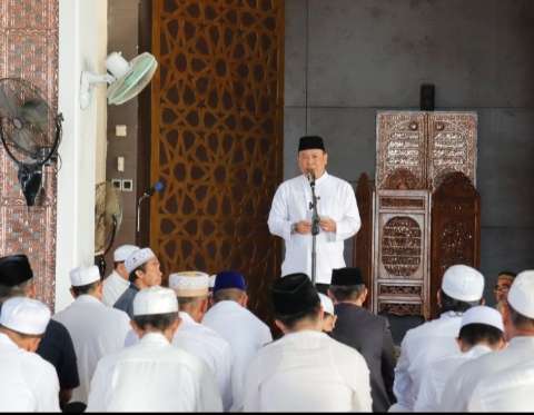 Turut shalat berjama’ah Sekda Batola Ir. H. Zulkipli Yadi Noor, M. Sc. , Kadis Kominfo Hery Sasmita, S.STP.,M.AP, Ketua MUI, pejabat Pemkab dan tokoh masyarakat di Marabahan.