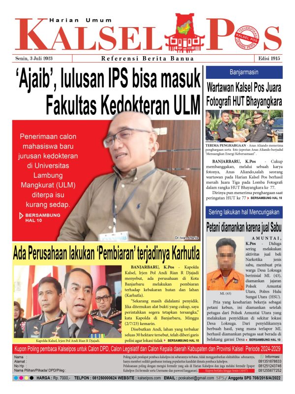 ‘Ajaib’, lulusan IPS bisa masuk Fakultas Kedokteran ULM. Kalselpos 1915 kalselpos3 Juli 20237 Januari 2024206 views Bacaan LainnyaTerkait Korupsi Dana Desa Rp657 juta, Eks Kades di Kusan Hilir divonis 3 TahunDireksi baru PAM Bandarmasih terbentuk, Zulbadi dipercaya jadi DirutParkir Pasar Wadai ‘mencekik’, Pengendara Motor ditagih Rp10 Ribu Kalsel Pos Berita Terkini, Kabar Terbaru Hari ini Banjarmasin Kalimantan Selatan dan Nasional Pos terkaitTerkait Korupsi Dana Desa Rp657 juta, Eks Kades di Kusan Hilir divonis 3 TahunDireksi baru PAM Bandarmasih terbentuk, Zulbadi dipercaya jadi DirutParkir Pasar Wadai ‘mencekik’, Pengendara Motor ditagih Rp10 Ribu