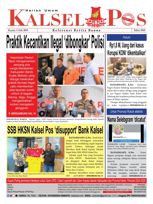 Praktik Kecantikan Ilegal ‘dibongkar’ Polisi. Kalselpos 1918 kalselpos6 Juli 2023133 views Bacaan LainnyaTerkait Korupsi Dana Desa Rp657 juta, Eks Kades di Kusan Hilir divonis 3 TahunDireksi baru PAM Bandarmasih terbentuk, Zulbadi dipercaya jadi DirutParkir Pasar Wadai ‘mencekik’, Pengendara Motor ditagih Rp10 Ribu Kalsel Pos Berita Terkini, Kabar Terbaru Hari ini Banjarmasin Kalimantan Selatan dan Nasional Pos terkaitTerkait Korupsi Dana Desa Rp657 juta, Eks Kades di Kusan Hilir divonis 3 TahunDireksi baru PAM Bandarmasih terbentuk, Zulbadi dipercaya jadi DirutParkir Pasar Wadai ‘mencekik’, Pengendara Motor ditagih Rp10 Ribu
