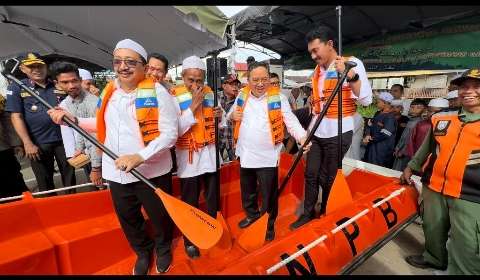 Anggota Dewan Perwakilan Rakyat (DPR) RI Syaifullah Tamliha didampingi Bupati Banjar H Saidi Mansyur dan Wakilnya Habib Idrus Al-Habsyie menyerahkan secara simbolis dengan menaiki perahu.