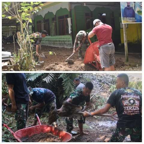 Kandangan, kalselpos.com Memaksimalkan pelaksanaan kegiatan1 Tentara Manunggal Membangun Desa (TMMD) ke-117 Kodim 1003/HSS, personel Satgas dan masyarakat melakukan gerak cepat pembangunan teras Masjid Jamiil Maghfiraah.