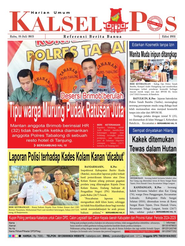 Desersi Brimob berulah. Kalselpos 1931 kalselpos26 Juli 2023203 views Bacaan LainnyaTerkait Korupsi Dana Desa Rp657 juta, Eks Kades di Kusan Hilir divonis 3 TahunDireksi baru PAM Bandarmasih terbentuk, Zulbadi dipercaya jadi DirutParkir Pasar Wadai ‘mencekik’, Pengendara Motor ditagih Rp10 Ribu Kalsel Pos Berita Terkini, Kabar Terbaru Hari ini Banjarmasin Kalimantan Selatan dan Nasional Pos terkaitTerkait Korupsi Dana Desa Rp657 juta, Eks Kades di Kusan Hilir divonis 3 TahunDireksi baru PAM Bandarmasih terbentuk, Zulbadi dipercaya jadi DirutParkir Pasar Wadai ‘mencekik’, Pengendara Motor ditagih Rp10 Ribu