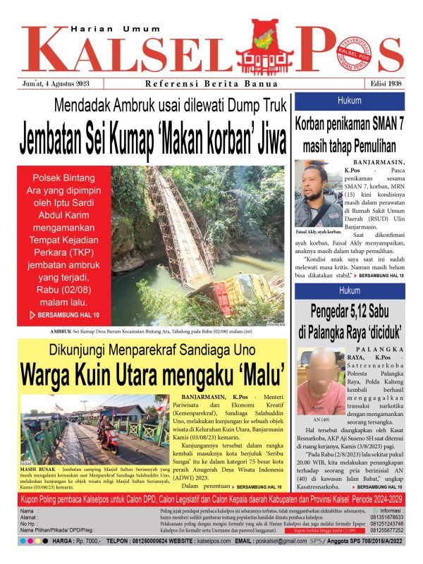 Jembatan Sei Kumap ‘Makan korban’ Jiwa. Kalselpos 1938 kalselpos4 Agustus 2023145 views Bacaan LainnyaTerkait Korupsi Dana Desa Rp657 juta, Eks Kades di Kusan Hilir divonis 3 TahunDireksi baru PAM Bandarmasih terbentuk, Zulbadi dipercaya jadi DirutParkir Pasar Wadai ‘mencekik’, Pengendara Motor ditagih Rp10 Ribu Kalsel Pos Berita Terkini, Kabar Terbaru Hari ini Banjarmasin Kalimantan Selatan dan Nasional Pos terkaitTerkait Korupsi Dana Desa Rp657 juta, Eks Kades di Kusan Hilir divonis 3 TahunDireksi baru PAM Bandarmasih terbentuk, Zulbadi dipercaya jadi DirutParkir Pasar Wadai ‘mencekik’, Pengendara Motor ditagih Rp10 Ribu
