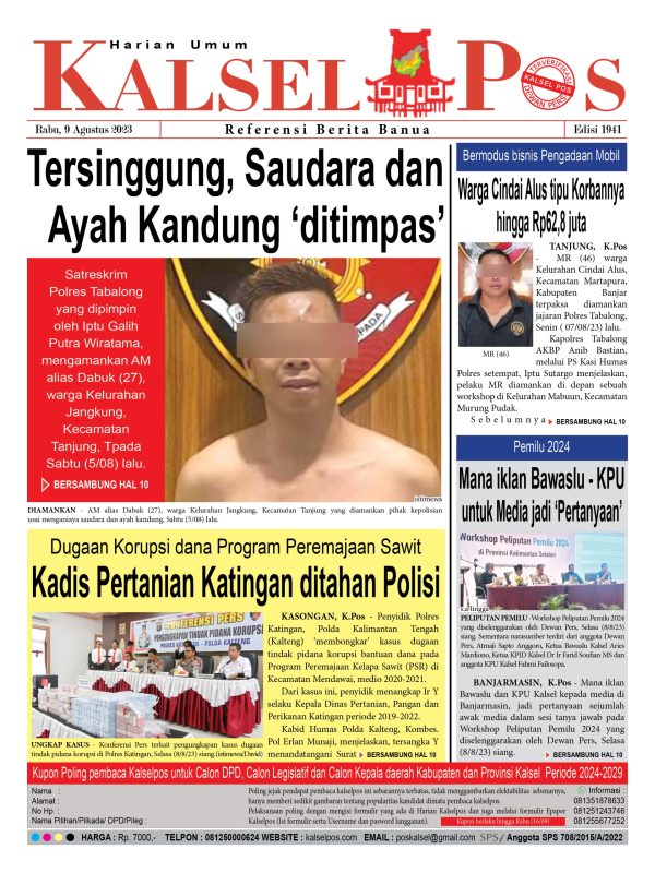 Tersinggung, Saudara dan Ayah Kandung ‘ditimpas’. Kalselpos 1941 kalselpos9 Agustus 2023217 views Bacaan LainnyaTerkait Korupsi Dana Desa Rp657 juta, Eks Kades di Kusan Hilir divonis 3 TahunDireksi baru PAM Bandarmasih terbentuk, Zulbadi dipercaya jadi DirutParkir Pasar Wadai ‘mencekik’, Pengendara Motor ditagih Rp10 Ribu Kalsel Pos Berita Terkini, Kabar Terbaru Hari ini Banjarmasin Kalimantan Selatan dan Nasional Pos terkaitTerkait Korupsi Dana Desa Rp657 juta, Eks Kades di Kusan Hilir divonis 3 TahunDireksi baru PAM Bandarmasih terbentuk, Zulbadi dipercaya jadi DirutParkir Pasar Wadai ‘mencekik’, Pengendara Motor ditagih Rp10 Ribu