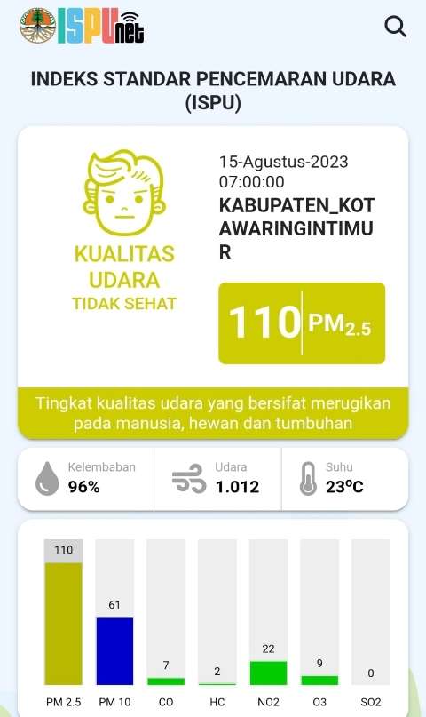 Pantauan Dinas Lingkungan Hidup (DLH) setempat sepanjang Senin (14/8/2023), indeks standar pencemar udara (ISPU) mencapai 108 dan masuk kategori Tidak Sehat. Bahkan pada Selasa (15/8/2023) pagi kondisinya cenderung memburuk dengan angka ISPU naik menjadi 110.