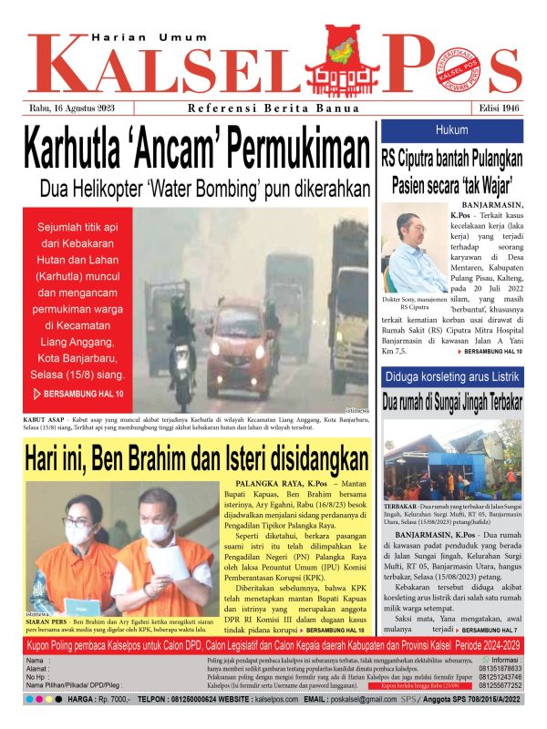 Karhutla ‘Ancam’ Permukiman. Kalselpos 1946 kalselpos16 Agustus 202316 Agustus 2023172 views Bacaan LainnyaTerkait Korupsi Dana Desa Rp657 juta, Eks Kades di Kusan Hilir divonis 3 TahunDireksi baru PAM Bandarmasih terbentuk, Zulbadi dipercaya jadi DirutParkir Pasar Wadai ‘mencekik’, Pengendara Motor ditagih Rp10 Ribu Kalsel Pos Berita Terkini, Kabar Terbaru Hari ini Banjarmasin Kalimantan Selatan dan Nasional Pos terkaitTerkait Korupsi Dana Desa Rp657 juta, Eks Kades di Kusan Hilir divonis 3 TahunDireksi baru PAM Bandarmasih terbentuk, Zulbadi dipercaya jadi DirutParkir Pasar Wadai ‘mencekik’, Pengendara Motor ditagih Rp10 Ribu