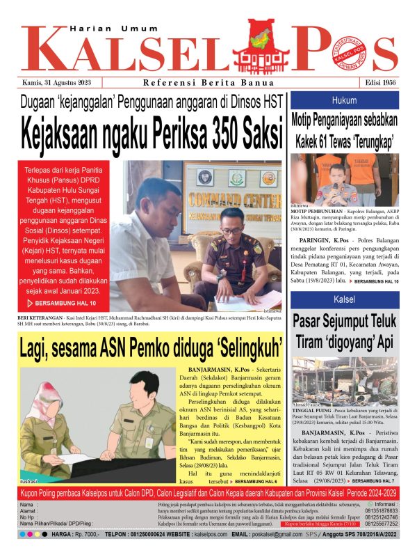 Kejaksaan ngaku Periksa 350 Saksi. Kalselpos 1956 kalselpos31 Agustus 2023117 views Bacaan LainnyaTerkait Korupsi Dana Desa Rp657 juta, Eks Kades di Kusan Hilir divonis 3 TahunDireksi baru PAM Bandarmasih terbentuk, Zulbadi dipercaya jadi DirutParkir Pasar Wadai ‘mencekik’, Pengendara Motor ditagih Rp10 Ribu Kalsel Pos Berita Terkini, Kabar Terbaru Hari ini Banjarmasin Kalimantan Selatan dan Nasional Pos terkaitTerkait Korupsi Dana Desa Rp657 juta, Eks Kades di Kusan Hilir divonis 3 TahunDireksi baru PAM Bandarmasih terbentuk, Zulbadi dipercaya jadi DirutParkir Pasar Wadai ‘mencekik’, Pengendara Motor ditagih Rp10 Ribu
