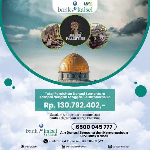 “Mari satukan solidaritas kemanusiaan untuk membantu saudara kita di Palestina dengan berdonasi melalui UPZ Bank Kalsel,” tertulis dilaman Instagram UPZ Bank Kalsel, Senin (30/10/2023).