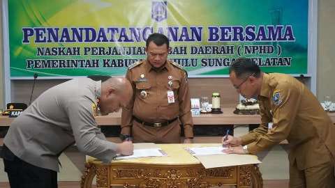 Penandatangan NPHD ditandatangani Kepala Dinas Kominfo Rahmawaty, Plt Kepala Dinas Perhubungan Hendro Martono, Kepala Badan Kesbangpol Rony, dan Kepala Pelaksana BPBD Kusairi, Kapolres HSS AKBP Leo Martin Pasaribu yang disaksikan Pj Bupati HSS Hermansyah.