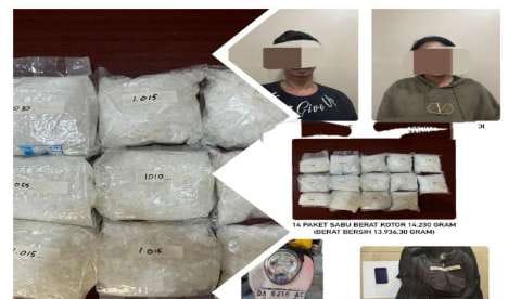 Petugas mencegat kedua tersangka yang ditemukan barang bukti sabu seberat 14 kilogram di dalam tas.