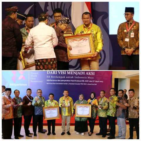 Dua penghargaan diterima langsung oleh Penjabat (Pj) Bupati HSS Hermansyah dalam acara apresiasi dan penyerahan hasil evaluasi AKIP, RB dan ZI tahun 2023, di Nusa Dua, Bali, Rabu, (06/12).