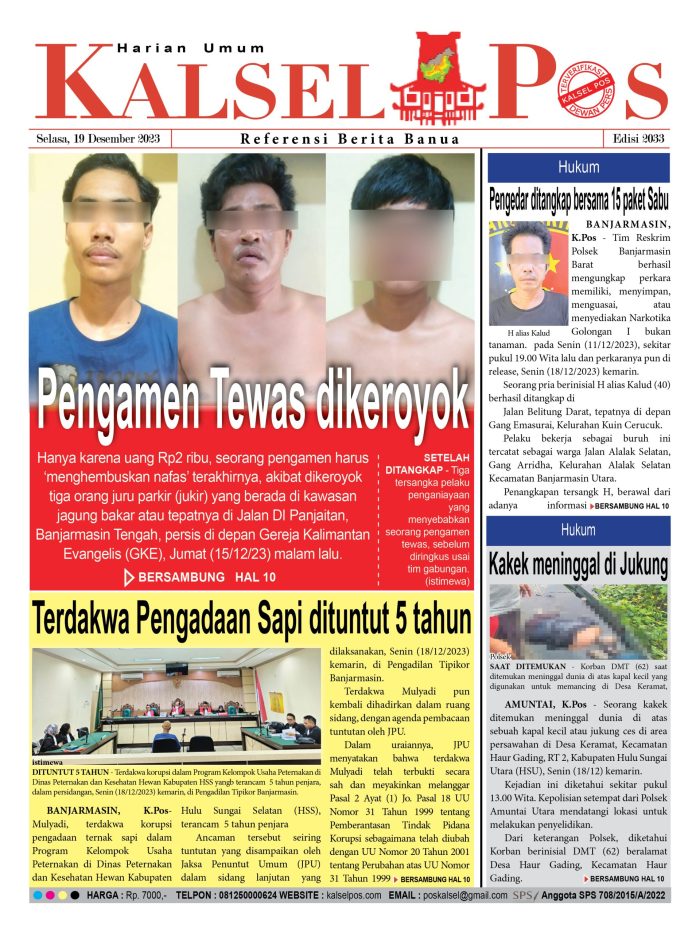 Pengamen Tewas dikeroyok. Kalselpos Edisi 2033 kalselpos19 Desember 2023177 views Indeks Halaman 1 Pengamen Tewas dikeroyok Terdakwa Pengadaan Sapi dituntut 5 tahun Pengedar ditangkap bersama 15 paket Sabu Kakek meninggal di Jukung DOWNLOAD EPAPER : DISINI Bacaan LainnyaTerkait Korupsi Dana Desa Rp657 juta, Eks Kades di Kusan Hilir divonis 3 TahunDireksi baru PAM Bandarmasih terbentuk, Zulbadi dipercaya jadi DirutParkir Pasar Wadai ‘mencekik’, Pengendara Motor ditagih Rp10 Ribu Kalsel Pos Berita Terkini, Kabar Terbaru Hari ini Banjarmasin Kalimantan Selatan dan Nasional Pos terkaitTerkait Korupsi Dana Desa Rp657 juta, Eks Kades di Kusan Hilir divonis 3 TahunDireksi baru PAM Bandarmasih terbentuk, Zulbadi dipercaya jadi DirutParkir Pasar Wadai ‘mencekik’, Pengendara Motor ditagih Rp10 Ribu