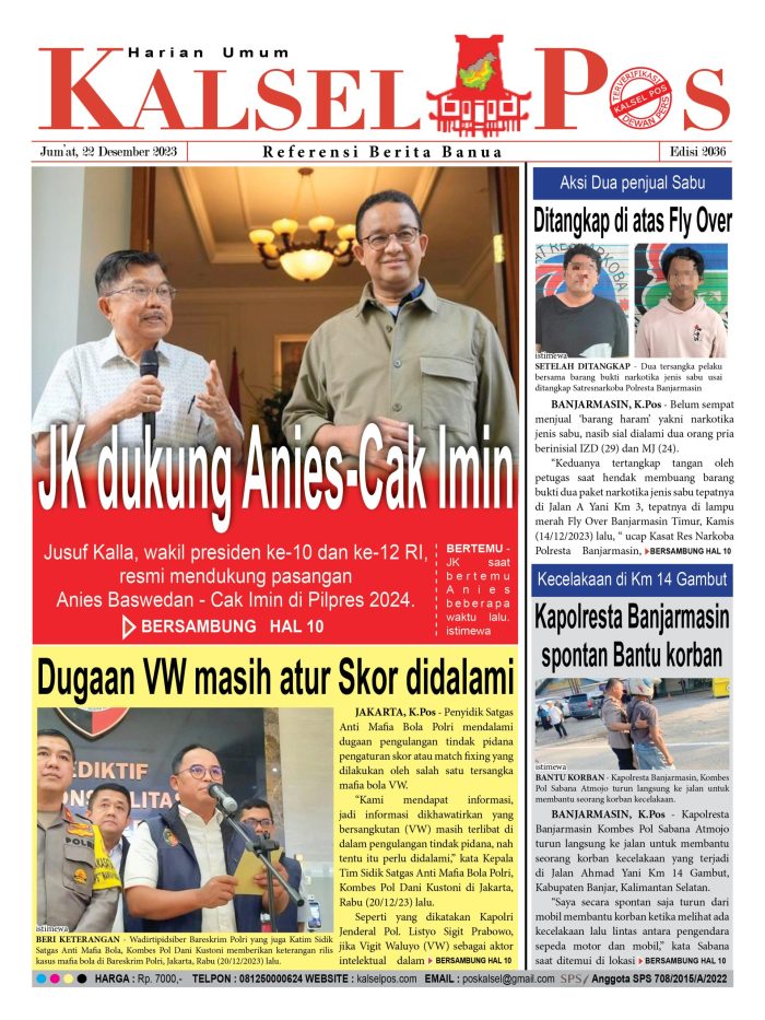 JK dukung Anies-Cak Imin. Kalselpos Edisi 2035 kalselpos22 Desember 2023161 views Indeks Halaman 1 JK dukung Anies-Cak Imin Dugaan VW masih atur Skor didalami Aksi Dua penjual Sabu, Ditangkap di atas Fly Over Kecelakaan di Km 14 Gambu, Kapolresta Banjarmasin spontan Bantu korban DOWNLOAD EPAPER DISINI Bacaan LainnyaTerkait Korupsi Dana Desa Rp657 juta, Eks Kades di Kusan Hilir divonis 3 TahunDireksi baru PAM Bandarmasih terbentuk, Zulbadi dipercaya jadi DirutParkir Pasar Wadai ‘mencekik’, Pengendara Motor ditagih Rp10 Ribu DOWNLOAD EPAPER DISINI Kalsel Pos Berita Terkini, Kabar Terbaru Hari ini Banjarmasin Kalimantan Selatan dan Nasional Pos terkaitTerkait Korupsi Dana Desa Rp657 juta, Eks Kades di Kusan Hilir divonis 3 TahunDireksi baru PAM Bandarmasih terbentuk, Zulbadi dipercaya jadi DirutParkir Pasar Wadai ‘mencekik’, Pengendara Motor ditagih Rp10 Ribu
