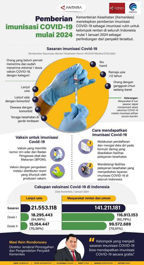 kalselpos.com– Kementerian Kesehatan (Kemenkes) menetapkan pemberian imunisasi Covid-19 sebagai imunisasi rutin untuk kelompok rentan di seluruh Indonesia mulai 1 Januari 2024 sebagai perlindungan dari penyakit tersebut.