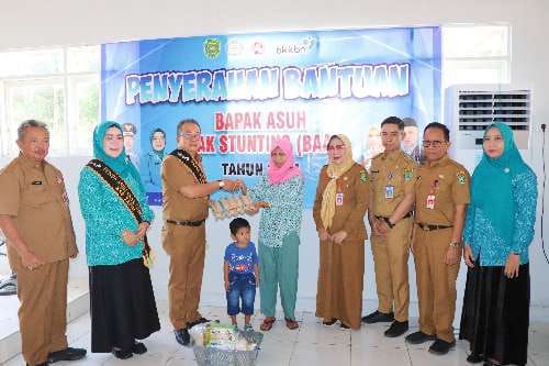 Usai membuka kegiatan Pj Bupati Tapin selaku bapak asuh memberikan bantuan kepada keluarga berisiko stunting dan meninjau pemasangan KB di mobil layanan KB.