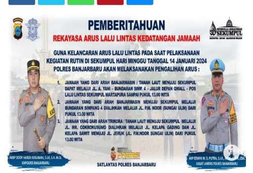 “Rekayasa arus lalu lintas sudah disiapkan baik bagi kendaraan yang menuju kawasan Sekumpul maupun kendaraan yang keluar Sekumpul,” ujar Kapolres Banjarbaru AKBP Dody Harza Kusumah.