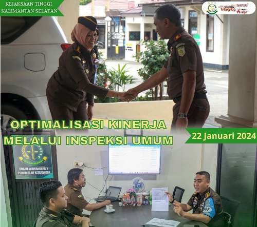 Tim Pengawasan Kejaksaan Tinggi Kalsel melakukan Inspeksi untuk pemeriksaan secara menyeluruh terhadap kepatuhan seluruh jajaran dalam mempedomani aturan dan petunjuk teknis kinerja maupun anggaran serta konduite segenap Korps Adhyaksa. Hal ini dilakukan dalam rangka menjaga kualitas, profesionalitas, intergritas dan akutanbilitas dalam menjalankan program kerja tahunan dan target kinerja tahun anggaran 2024.