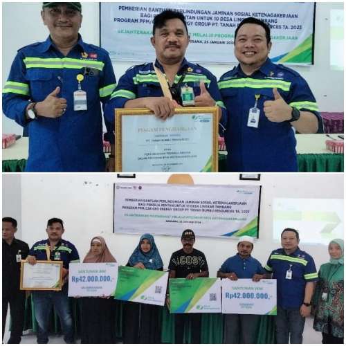 Pemberian bantuan perlindungan jaminan sosial kenagakerjaan bagi pekerja rentan untuk 10 desa lingkar tambang, merupakan bagian dari program PPM/CSR Geo Energy Group melalui PT TBR tahun 2023.