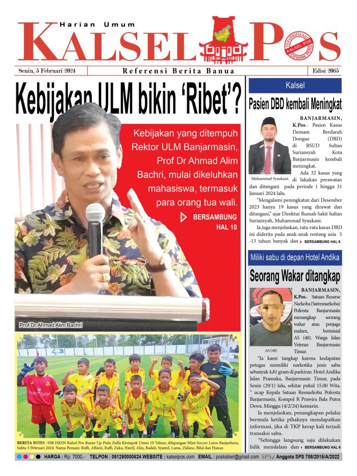 Kebijakan ULM bikin ‘Ribet’? kalselpos5 Februari 20245 Februari 2024135 views Kebijakan ULM bikin ‘Ribet’? Pasien DBD kembali Meningkat Miliki sabu di depan Hotel Andika, Seorang Wakar ditangkap Download Epaper Disini Download Epaper Disini Kalsel Pos Berita Terkini, Kabar Terbaru Hari ini Banjarmasin Kalimantan Selatan dan Nasional Pos terkaitTerkait Korupsi Dana Desa Rp657 juta, Eks Kades di Kusan Hilir divonis 3 TahunDireksi baru PAM Bandarmasih terbentuk, Zulbadi dipercaya jadi DirutParkir Pasar Wadai ‘mencekik’, Pengendara Motor ditagih Rp10 Ribu