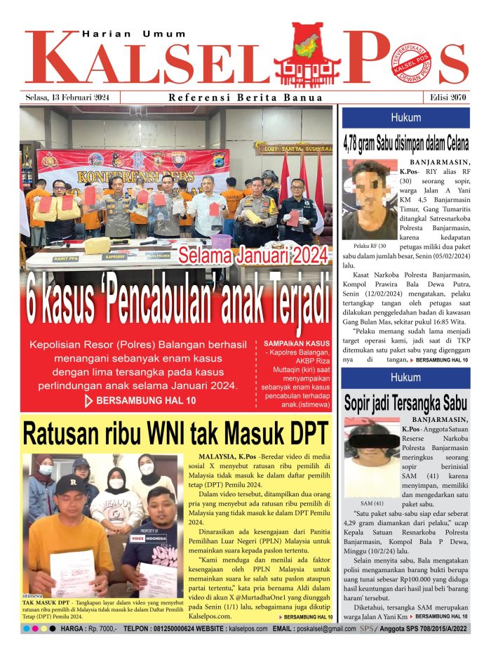 Selama Januari 2024, 6 kasus ‘Pencabulan’ anak Terjadi kalselpos13 Februari 2024231 views Selama Januari 2024, 6 kasus ‘Pencabulan’ anak Terjadi Ratusan ribu WNI tak Masuk DPT 4,78 gram Sabu disimpan dalam Celana Sopir jadi Tersangka Sabu Download Epaper Disini Bacaan LainnyaTerkait Korupsi Dana Desa Rp657 juta, Eks Kades di Kusan Hilir divonis 3 TahunDireksi baru PAM Bandarmasih terbentuk, Zulbadi dipercaya jadi DirutParkir Pasar Wadai ‘mencekik’, Pengendara Motor ditagih Rp10 Ribu Download Epaper Disini Kalsel Pos Berita Terkini, Kabar Terbaru Hari ini Banjarmasin Kalimantan Selatan dan Nasional Pos terkaitTerkait Korupsi Dana Desa Rp657 juta, Eks Kades di Kusan Hilir divonis 3 TahunDireksi baru PAM Bandarmasih terbentuk, Zulbadi dipercaya jadi DirutParkir Pasar Wadai ‘mencekik’, Pengendara Motor ditagih Rp10 Ribu