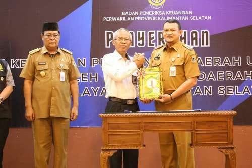 LKPD diserahkan langsung kepada Kepala BPK Kalsel Rahmadi yang disaksikan oleh Gubernur Kalsel Sahbirin Noor dan dihadiri Sekda Muhammad Noor, Asisten Setda, Inspektur dan Kepala BPKPD Kabupaten HSS.