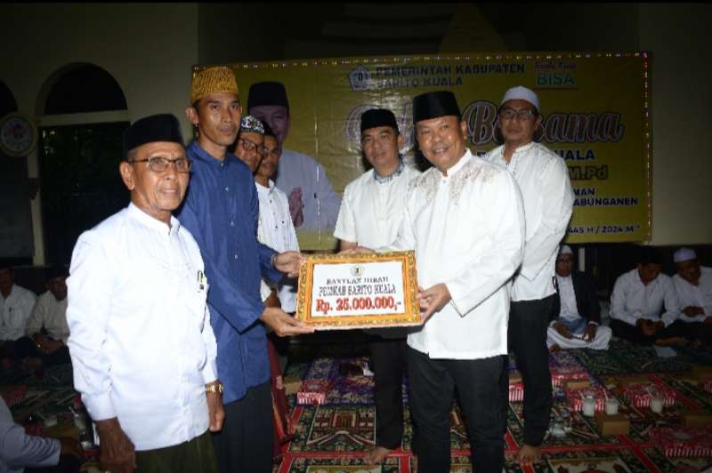 Berlangsung di Masjid Jami Musyarakatul Aman, Mujiyat menyerahkan Bantuan Uang Hibah dari Pemkab Batola sebesar 25 juta rupiah, dana CSR Bank Kalsel 10 juta rupiah dan dana CSR dari PT. Talenta Bumi 10 juta rupiah.