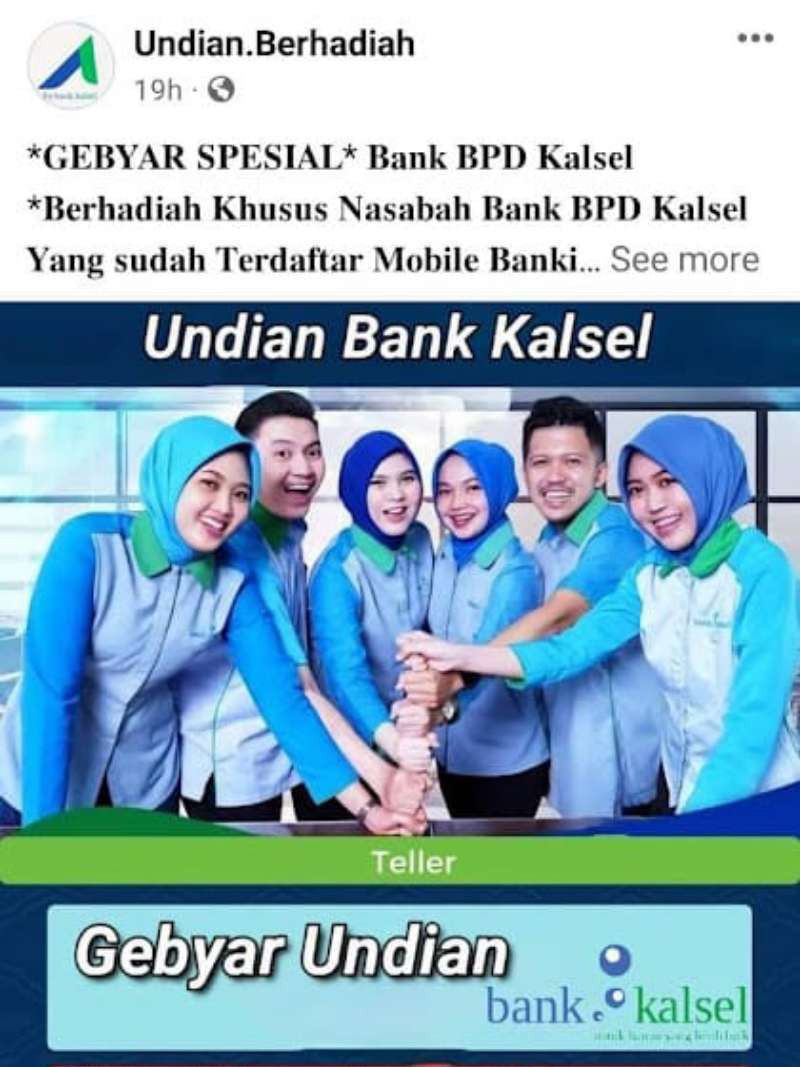 Beragam modus penipuan dengan modus soceng dapat ditemui saat ini, terbaru yang sedang marak adalah dengan iklan undian palsu di media sosial Facebook dan Instagram yang mengatasnamakan Bank Kalsel.
