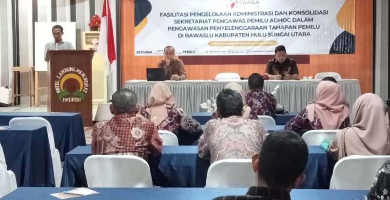 Sebelum berakhirnya tugas para Komisioner Panwascam tersebut, Badan Pengawas Pemilu (Bawaslu) Kabupaten HSU kembali melaksanakan fasilitasi pengelolaan administrasi dan konsolidasi sekretariat pengawas pemilu ad hoc dalam penyelenggaraan tahapan pemilu di Bawaslu Kabupaten HSU di Hotel Lambung Mangkurat, 4-5 April 2024.