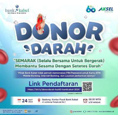 Untuk pendaftaran bisa melalui link ini, donordarah-hut60-bankkalsel-2024.