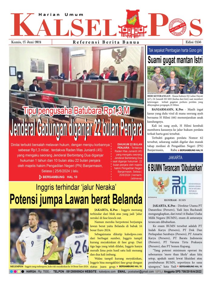 Tipu pengusaha Batubara Rp1,3 M, Jenderal Gadungan diganjar 22 bulan Penjara kalselpos27 Juni 2024329 views Tipu pengusaha Batubara Rp1,3 M, Jenderal Gadungan diganjar 22 bulan Penjara Inggris terhindar ‘jalur Neraka’, Potensi jumpa Lawan berat Belanda Tak sepakat Pembagian harta Gono gini, Suami gugat mantan Istri 6 BUMN Terancam ‘Dibubarkan’ Download Epaper Disini Bacaan LainnyaTerkait Korupsi Dana Desa Rp657 juta, Eks Kades di Kusan Hilir divonis 3 TahunDireksi baru PAM Bandarmasih terbentuk, Zulbadi dipercaya jadi DirutParkir Pasar Wadai ‘mencekik’, Pengendara Motor ditagih Rp10 Ribu Download Epaper Disini Kalsel Pos Berita Terkini, Kabar Terbaru Hari ini Banjarmasin Kalimantan Selatan dan Nasional Pos terkaitTerkait Korupsi Dana Desa Rp657 juta, Eks Kades di Kusan Hilir divonis 3 TahunDireksi baru PAM Bandarmasih terbentuk, Zulbadi dipercaya jadi DirutParkir Pasar Wadai ‘mencekik’, Pengendara Motor ditagih Rp10 Ribu