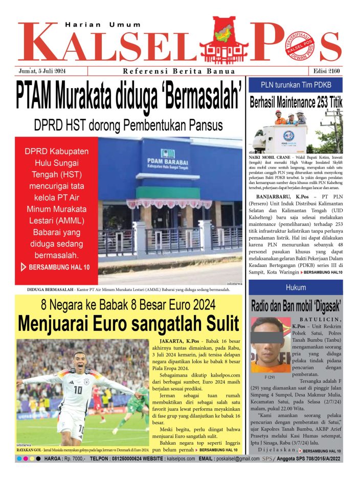 PTAM Murakata diduga ‘Bermasalah’, DPRD HST dorong Pembentukan Pansus kalselpos5 Juli 2024479 views PTAM Murakata diduga ‘Bermasalah’, DPRD HST dorong Pembentukan Pansus 8 Negara ke Babak 8 Besar Euro 2024, Menjuarai Euro sangatlah Sulit PLN turunkan Tim PDKB, Berhasil Maintenance 253 Titik Radio dan Ban mobil ‘Digasak’ Download Epaper Disini Bacaan LainnyaTerkait Korupsi Dana Desa Rp657 juta, Eks Kades di Kusan Hilir divonis 3 TahunDireksi baru PAM Bandarmasih terbentuk, Zulbadi dipercaya jadi DirutParkir Pasar Wadai ‘mencekik’, Pengendara Motor ditagih Rp10 Ribu Download Epaper Disini Kalsel Pos Berita Terkini, Kabar Terbaru Hari ini Banjarmasin Kalimantan Selatan dan Nasional Pos terkaitTerkait Korupsi Dana Desa Rp657 juta, Eks Kades di Kusan Hilir divonis 3 TahunDireksi baru PAM Bandarmasih terbentuk, Zulbadi dipercaya jadi DirutParkir Pasar Wadai ‘mencekik’, Pengendara Motor ditagih Rp10 Ribu