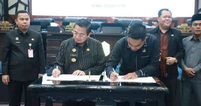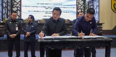 PENANDATANGANAN – Ketua DPRD Kota Banjarmasin, H Harry Wijaya, menandatangani nota kesepakatan bersama Perubahan KUA dan PPAS Banjarmasin Tahun Anggaran 2024 dan Kebijakan Umum APBD (KUA) dan Prioritas Anggaran Sementara (PPAS) Kota Banjarmasin Tahun Anggaran 2025.(kalselpos.com)