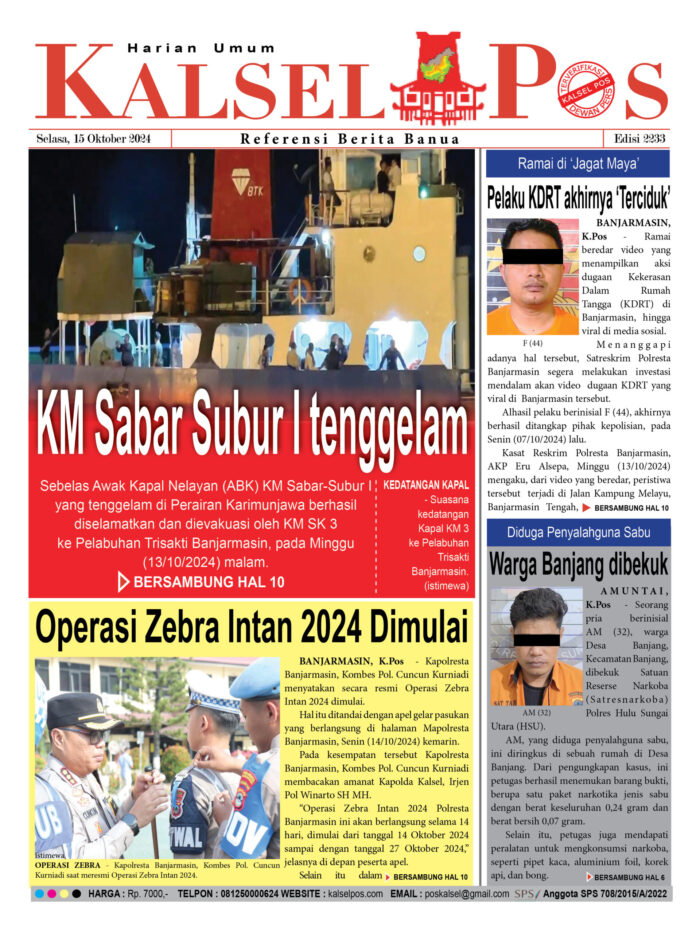 KM Sabar Subur I tenggelam kalselpos14 Oktober 2024394 views KM Sabar Subur I tenggelam Operasi Zebra Intan 2024 Dimulai Ramai di ‘Jagat Maya’, Pelaku KDRT akhirnya ‘Terciduk’ Diduga Penyalahguna Sabu, Warga Banjang dibekuk Download Epaper Disini Bacaan LainnyaTerkait Korupsi Dana Desa Rp657 juta, Eks Kades di Kusan Hilir divonis 3 TahunDireksi baru PAM Bandarmasih terbentuk, Zulbadi dipercaya jadi DirutParkir Pasar Wadai ‘mencekik’, Pengendara Motor ditagih Rp10 Ribu Download Epaper Disini Kalsel Pos Berita Terkini, Kabar Terbaru Hari ini Banjarmasin Kalimantan Selatan dan Nasional Pos terkaitTerkait Korupsi Dana Desa Rp657 juta, Eks Kades di Kusan Hilir divonis 3 TahunDireksi baru PAM Bandarmasih terbentuk, Zulbadi dipercaya jadi DirutParkir Pasar Wadai ‘mencekik’, Pengendara Motor ditagih Rp10 Ribu