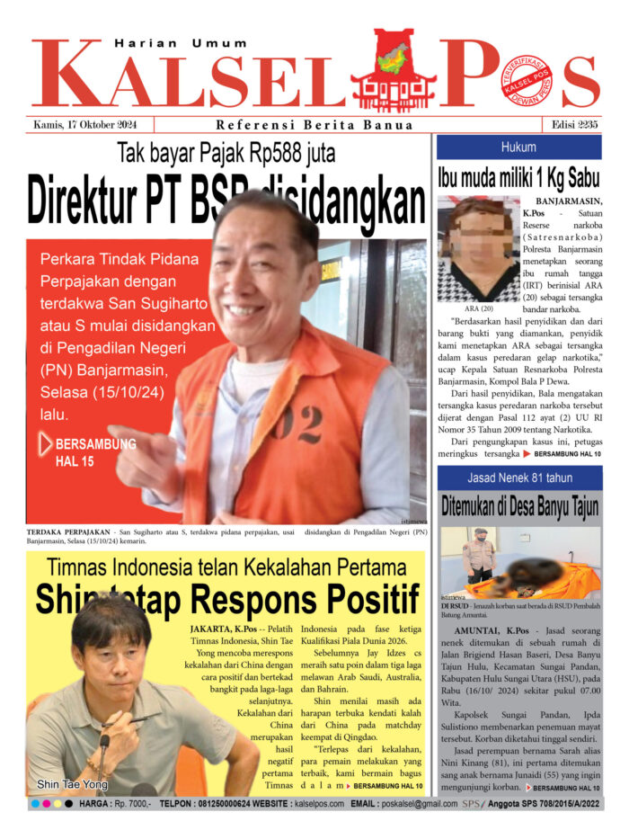 Tak bayar Pajak Rp588 juta, Direktur PT BSB disidangkan kalselpos17 Oktober 202417 Oktober 2024476 views Tak bayar Pajak Rp588 juta, Direktur PT BSB disidangkan Timnas Indonesia telan Kekalahan Pertama, Shin tetap Respons Positif Ibu muda miliki 1 Kg Sabu Jasad Nenek 81 tahun, Ditemukan di Desa Banyu Tajun Download Epaper Disini Bacaan LainnyaTerkait Korupsi Dana Desa Rp657 juta, Eks Kades di Kusan Hilir divonis 3 TahunDireksi baru PAM Bandarmasih terbentuk, Zulbadi dipercaya jadi DirutParkir Pasar Wadai ‘mencekik’, Pengendara Motor ditagih Rp10 Ribu Download Epaper Disini Kalsel Pos Berita Terkini, Kabar Terbaru Hari ini Banjarmasin Kalimantan Selatan dan Nasional Pos terkaitTerkait Korupsi Dana Desa Rp657 juta, Eks Kades di Kusan Hilir divonis 3 TahunDireksi baru PAM Bandarmasih terbentuk, Zulbadi dipercaya jadi DirutParkir Pasar Wadai ‘mencekik’, Pengendara Motor ditagih Rp10 Ribu