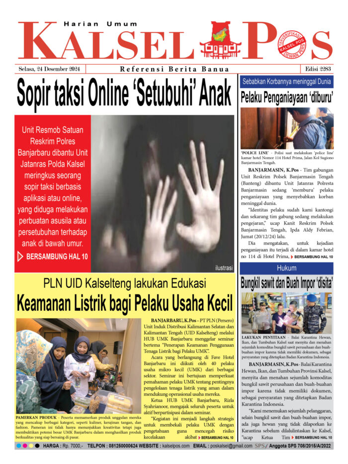 Sopir taksi Online ‘Setubuhi’ Anak kalselpos24 Desember 202424 Desember 2024554 views Sopir taksi Online ‘Setubuhi’ Anak PLN UID Kalselteng lakukan Edukasi, Keamanan Listrik bagi Pelaku Usaha Kecil Sebabkan Korbannya meninggal Dunia, Pelaku Penganiayaan ‘diburu’ Bungkil sawit dan Buah Impor ‘disita’ Download Epaper Disini Bacaan LainnyaTerkait Korupsi Dana Desa Rp657 juta, Eks Kades di Kusan Hilir divonis 3 TahunDireksi baru PAM Bandarmasih terbentuk, Zulbadi dipercaya jadi DirutParkir Pasar Wadai ‘mencekik’, Pengendara Motor ditagih Rp10 Ribu Download Epaper Disini Kalsel Pos Berita Terkini, Kabar Terbaru Hari ini Banjarmasin Kalimantan Selatan dan Nasional Pos terkaitTerkait Korupsi Dana Desa Rp657 juta, Eks Kades di Kusan Hilir divonis 3 TahunDireksi baru PAM Bandarmasih terbentuk, Zulbadi dipercaya jadi DirutParkir Pasar Wadai ‘mencekik’, Pengendara Motor ditagih Rp10 Ribu