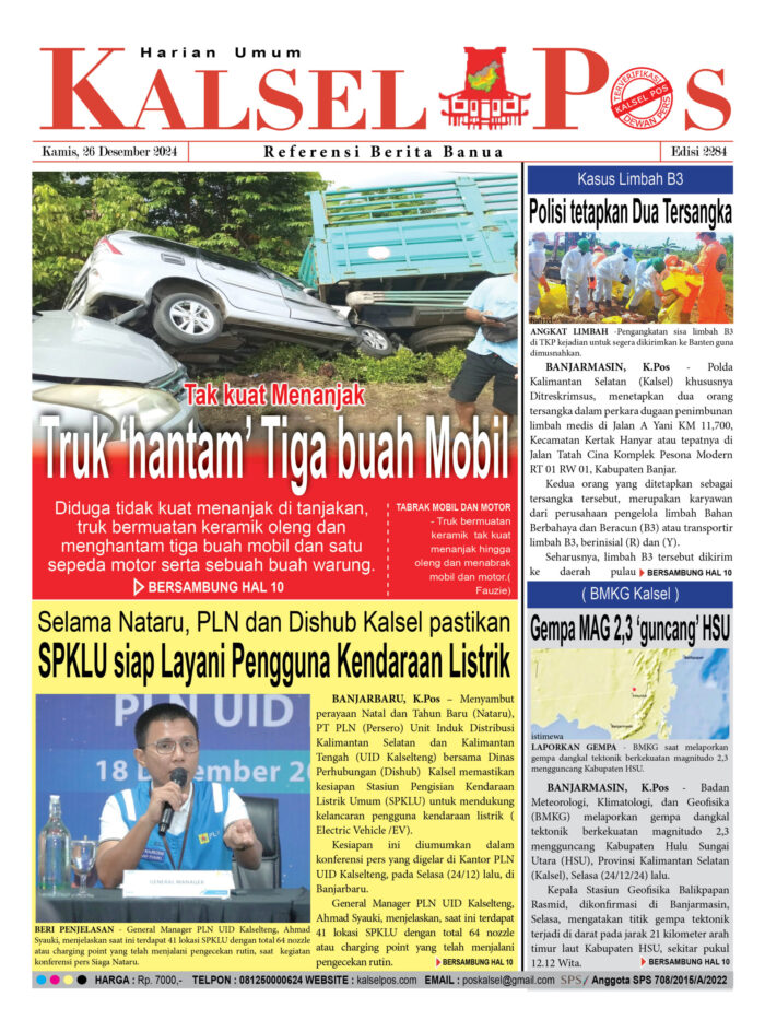 Tak kuat Menanjak, Truk ‘hantam’ Tiga buah Mobil kalselpos26 Desember 202426 Desember 2024786 views Tak kuat Menanjak, Truk ‘hantam’ Tiga buah Mobil Selama Nataru, PLN dan Dishub Kalsel pastikan, SPKLU siap Layani Pengguna Kendaraan Listrik Kasus Limbah B3, Polisi tetapkan Dua Tersangka Gempa MAG 2,3 ‘guncang’ HSU Download Epaper Disini Bacaan LainnyaTerkait Korupsi Dana Desa Rp657 juta, Eks Kades di Kusan Hilir divonis 3 TahunDireksi baru PAM Bandarmasih terbentuk, Zulbadi dipercaya jadi DirutParkir Pasar Wadai ‘mencekik’, Pengendara Motor ditagih Rp10 Ribu Download Epaper Disini Kalsel Pos Berita Terkini, Kabar Terbaru Hari ini Banjarmasin Kalimantan Selatan dan Nasional Pos terkaitTerkait Korupsi Dana Desa Rp657 juta, Eks Kades di Kusan Hilir divonis 3 TahunDireksi baru PAM Bandarmasih terbentuk, Zulbadi dipercaya jadi DirutParkir Pasar Wadai ‘mencekik’, Pengendara Motor ditagih Rp10 Ribu