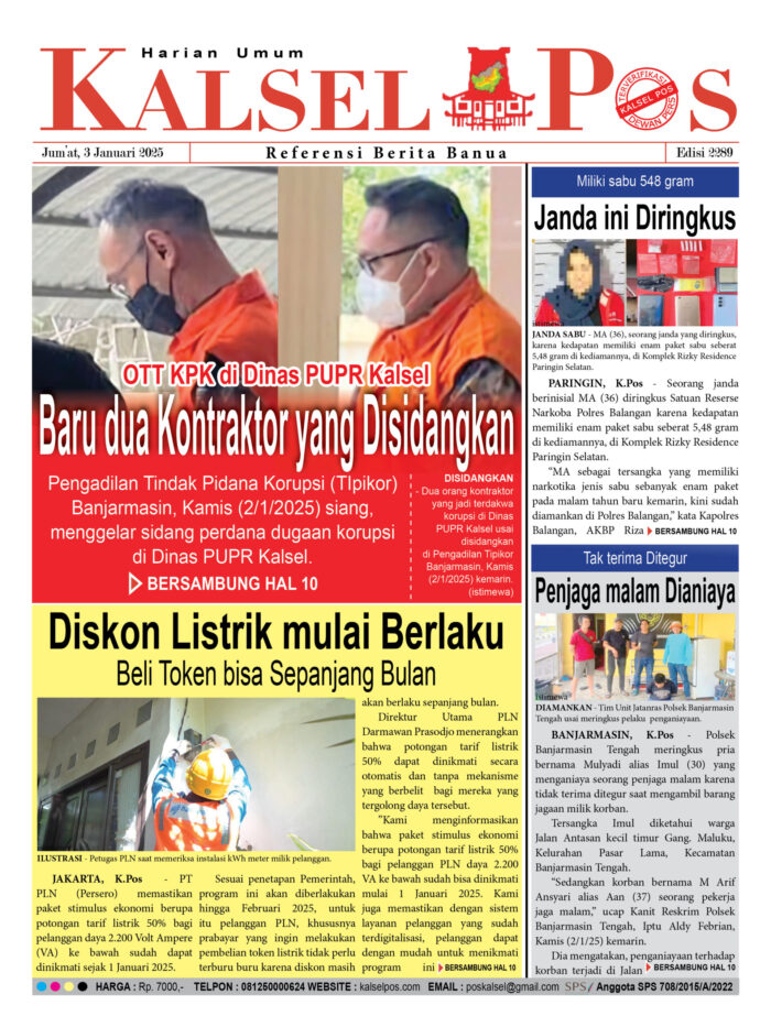 OTT KPK di Dinas PUPR Kalsel kalselpos3 Januari 2025907 views OTT KPK di Dinas PUPR Kalsel Diskon Listrik mulai Berlaku Miliki sabu 548 gram Penjaga malam Dianiaya Download Epaper Disini Bacaan LainnyaTerkait Korupsi Dana Desa Rp657 juta, Eks Kades di Kusan Hilir divonis 3 TahunDireksi baru PAM Bandarmasih terbentuk, Zulbadi dipercaya jadi DirutParkir Pasar Wadai ‘mencekik’, Pengendara Motor ditagih Rp10 Ribu Download Epaper Disini Kalsel Pos Berita Terkini, Kabar Terbaru Hari ini Banjarmasin Kalimantan Selatan dan Nasional Pos terkaitTerkait Korupsi Dana Desa Rp657 juta, Eks Kades di Kusan Hilir divonis 3 TahunDireksi baru PAM Bandarmasih terbentuk, Zulbadi dipercaya jadi DirutParkir Pasar Wadai ‘mencekik’, Pengendara Motor ditagih Rp10 Ribu