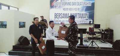 Diakhir kegiatan Dandim 1001 Amuntai – Balangan, Letkol Kav. Guntyo Ady Wirawan memberikan bingkisan kepada Ketua PWI HSU dan Balangan secara simbolis.