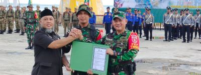 Sebelum upacara berakhir acara juga diisi dengan penandatanganan naskah program TMMD dan penyematan tanda peserta dan penyerahan sarana kerja secara simbolis.