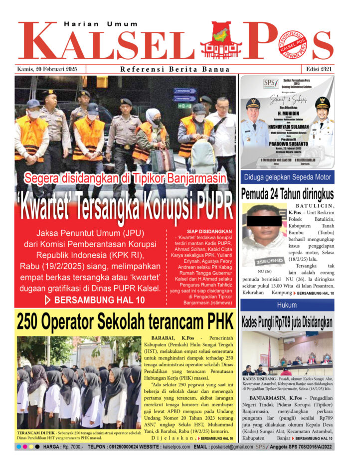 ‘Kwartet’ Tersangka Korupsi PUPR, Segera disidangkan di Tipikor Banjarmasin kalselpos20 Februari 202514 Maret 2025614 views ‘Kwartet’ Tersangka Korupsi PUPR, Segera disidangkan di Tipikor Banjarmasin 250 Operator Sekolah terancam PHK Diduga gelapkan Sepeda Motor, Pemuda 24 Tahun diringkus Kades Pungli Rp709 juta Disidangkan Download Epaper Disini Bacaan LainnyaTerkait Korupsi Dana Desa Rp657 juta, Eks Kades di Kusan Hilir divonis 3 TahunDireksi baru PAM Bandarmasih terbentuk, Zulbadi dipercaya jadi DirutParkir Pasar Wadai ‘mencekik’, Pengendara Motor ditagih Rp10 Ribu Download Epaper Disini Kalsel Pos Berita Terkini, Kabar Terbaru Hari ini Banjarmasin Kalimantan Selatan dan Nasional Pos terkaitTerkait Korupsi Dana Desa Rp657 juta, Eks Kades di Kusan Hilir divonis 3 TahunDireksi baru PAM Bandarmasih terbentuk, Zulbadi dipercaya jadi DirutParkir Pasar Wadai ‘mencekik’, Pengendara Motor ditagih Rp10 Ribu