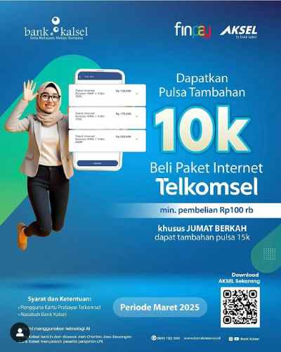 Terbaru promo yang diberikan Aksel Bank Kalsel, yaitu kalau beli paket Internet Telkomsel dengan minimal pembelian Rp100.000 bisa mendapatkan pulsa hingga Rp10.000. Bahkan khusus untuk Jumat berkah, bisa mendapatkan pulsa tambahan hingga Rp15.000.