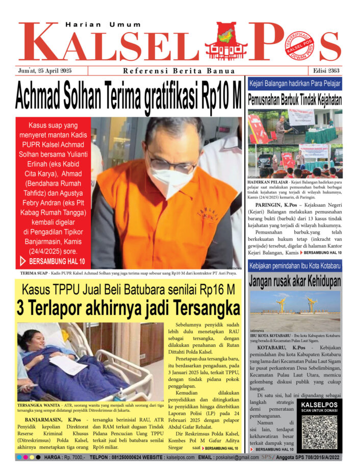 Achmad Solhan Terima gratifikasi Rp10 M Zainal1 Mei 2025285 views Achmad Solhan Terima gratifikasi Rp10 M 3 Terlapor akhirnya jadi Tersangka, Kasus TPPU Jual Beli Batubara senilai Rp16 M Pemusnahan Barbuk Tindak Kejahatan, Kejari Balangan hadirkan Para Pelajar Jangan rusak akar Kehidupan, Kebijakan pemindahan Ibu Kota Kotabaru Download Epaper Disini Bacaan LainnyaTerkait Korupsi Dana Desa Rp657 juta, Eks Kades di Kusan Hilir divonis 3 TahunDireksi baru PAM Bandarmasih terbentuk, Zulbadi dipercaya jadi DirutParkir Pasar Wadai ‘mencekik’, Pengendara Motor ditagih Rp10 Ribu Download Epaper Disini Kalsel Pos Berita Terkini, Kabar Terbaru Hari ini Banjarmasin Kalimantan Selatan dan Nasional Pos terkaitTerkait Korupsi Dana Desa Rp657 juta, Eks Kades di Kusan Hilir divonis 3 TahunDireksi baru PAM Bandarmasih terbentuk, Zulbadi dipercaya jadi DirutParkir Pasar Wadai ‘mencekik’, Pengendara Motor ditagih Rp10 Ribu