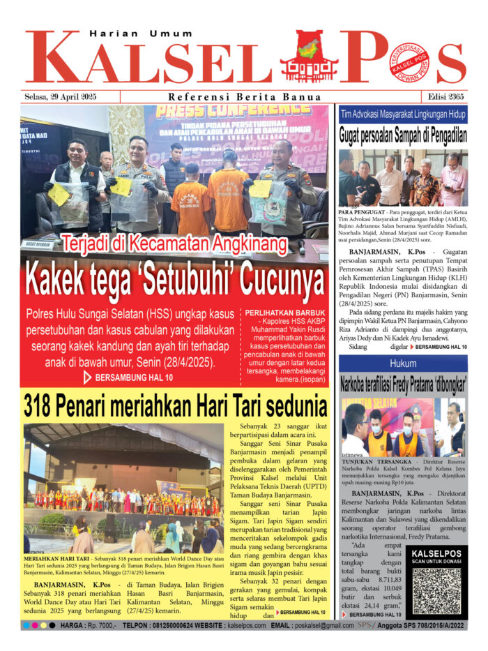 Kakek Tega Setubuhi Cucunya Zainal1 Mei 2025421 views Kakek tega ‘Setubuhi’ Cucunya, Terjadi di Kecamatan Angkinang 318 Penari meriahkan Hari Tari sedunia Tim Advokasi Masyarakat Lingkungan Hidup, Gugat persoalan Sampah di Pengadilan Narkoba terafiliasi Fredy Pratama ‘dibongkar’ Download Epaper Disini Bacaan LainnyaTerkait Korupsi Dana Desa Rp657 juta, Eks Kades di Kusan Hilir divonis 3 TahunDireksi baru PAM Bandarmasih terbentuk, Zulbadi dipercaya jadi DirutParkir Pasar Wadai ‘mencekik’, Pengendara Motor ditagih Rp10 Ribu Download Epaper Disini Kalsel Pos Berita Terkini, Kabar Terbaru Hari ini Banjarmasin Kalimantan Selatan dan Nasional Pos terkaitTerkait Korupsi Dana Desa Rp657 juta, Eks Kades di Kusan Hilir divonis 3 TahunDireksi baru PAM Bandarmasih terbentuk, Zulbadi dipercaya jadi DirutParkir Pasar Wadai ‘mencekik’, Pengendara Motor ditagih Rp10 Ribu