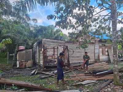 TMMD Reguler ke-124 Kodim 1012/Buntok terus berupaya meringankan beban masyarakat yang kurang mampu, yaitu merenovasi salah satu rumah warga di Desa Wungkur Baru, Kecamatan Gunung Bintang Awai, Kabupaten Barito Selatan, Kalimantan Tengah, Minggu (18/05/2025).