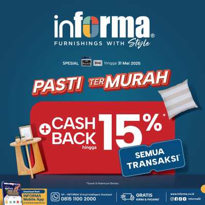 Relaksasi di rumah bukan lagi wacana — karena sekarang kamu bisa mewujudkannya dengan harga paling hemat di INFORMA. Dan yang lebih menarik, selama periode promo hingga akhir Mei ini, semua produk unggulan bisa kamu dapatkan dengan cashback hingga 15 persen untuk semua transaksi.