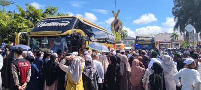 Ratusan jemaah haji Kabupaten HSU yang akan berangkat ke Tanah Haram ini dilepas langsung Bupati HSU H Sahrujani didampingi Wakil Bupati HSU Hero Setiawan.