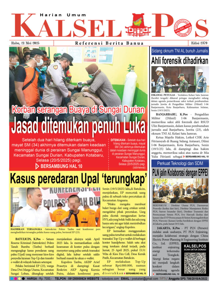 Jasad ditemukan penuh Luka, Korban serangan Buaya di Sungai Durian Zainal20 Mei 202524 Desember 2025608 views Jasad ditemukan penuh Luka, Korban serangan Buaya di Sungai Durian Kasus peredaran Upal ‘terungkap’ Ahli forensik dihadirkan, Sidang oknum TNI AL bunuh Jurnalis PLN jalin Kolaborasi dengan EPPEI, Perkuat Teknologi dan SDM Download Epaper Disini Bacaan LainnyaTerkait Korupsi Dana Desa Rp657 juta, Eks Kades di Kusan Hilir divonis 3 TahunDireksi baru PAM Bandarmasih terbentuk, Zulbadi dipercaya jadi DirutParkir Pasar Wadai ‘mencekik’, Pengendara Motor ditagih Rp10 Ribu Download Epaper Disini Kalsel Pos Berita Terkini, Kabar Terbaru Hari ini Banjarmasin Kalimantan Selatan dan Nasional Pos terkaitTerkait Korupsi Dana Desa Rp657 juta, Eks Kades di Kusan Hilir divonis 3 TahunDireksi baru PAM Bandarmasih terbentuk, Zulbadi dipercaya jadi DirutParkir Pasar Wadai ‘mencekik’, Pengendara Motor ditagih Rp10 Ribu