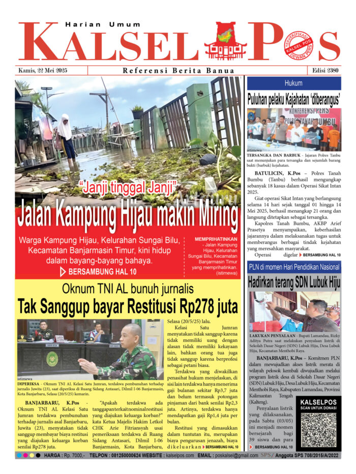 Jalan Kampung Hijau makin Miring, “Janji tinggal Janji” Zainal21 Mei 202522 Mei 2025569 views Jalan Kampung Hijau makin Miring, “Janji tinggal Janji” Tak Sanggup bayar Restitusi Rp278 juta, Oknum TNI AL bunuh jurnalis Puluhan pelaku Kajahatan ‘diberangus’ Hadirkan terang SDN Lubuk Hiju, PLN di momen Hari Pendidikan Nasional Download Epaper Disini Bacaan LainnyaBuruh dikeroyok Hingga Tewas, Tersangka Pelaku Serahkan DiriTiga sopir Positif narkoba, Terjaring razia tes Urine BNNK BalanganParkir “Nakal” Pasar Wadai disikat, Lahan yang Tarik Rp10 Ribu disegel Download Epaper Disini Kalsel Pos Berita Terkini, Kabar Terbaru Hari ini Banjarmasin Kalimantan Selatan dan Nasional Pos terkaitBuruh dikeroyok Hingga Tewas, Tersangka Pelaku Serahkan DiriTiga sopir Positif narkoba, Terjaring razia tes Urine BNNK BalanganParkir “Nakal” Pasar Wadai disikat, Lahan yang Tarik Rp10 Ribu disegel