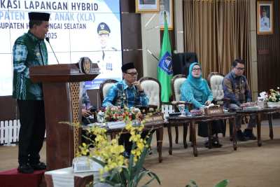 Kandangan,kalselpos.com– Bupati Hulu Sungai Selatan (HSS) Syafrudin Noor dan Wakil Bupati (Wabup) Suriani menghadiri verifikasi lapangan hybrid Kabupaten Layak Anak (KLA) 2025, dari Kementerian Pemberdayaan Perempuan dan Perlindungan Anak (Kemen PPPA) Republik Indonesia (RI), Kamis (22/5/2025) di Pendopo Bupati HSS.