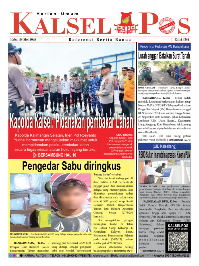 Kapolda Kalsel :Pidanakan pembakar Lahan Zainal28 Mei 2025493 views Kapolda Kalsel :Pidanakan pembakar Lahan Pengedar Sabu diringkus Lurah enggan Batalkan Surat Tanah, Meski ada Putusan PN Banjarbaru RSUD Sultan Imanuddin apresiasi Kinerja PLN Download Epaper Disini Bacaan LainnyaTerkait Korupsi Dana Desa Rp657 juta, Eks Kades di Kusan Hilir divonis 3 TahunDireksi baru PAM Bandarmasih terbentuk, Zulbadi dipercaya jadi DirutParkir Pasar Wadai ‘mencekik’, Pengendara Motor ditagih Rp10 Ribu Download Epaper Disini Kalsel Pos Berita Terkini, Kabar Terbaru Hari ini Banjarmasin Kalimantan Selatan dan Nasional Pos terkaitTerkait Korupsi Dana Desa Rp657 juta, Eks Kades di Kusan Hilir divonis 3 TahunDireksi baru PAM Bandarmasih terbentuk, Zulbadi dipercaya jadi DirutParkir Pasar Wadai ‘mencekik’, Pengendara Motor ditagih Rp10 Ribu